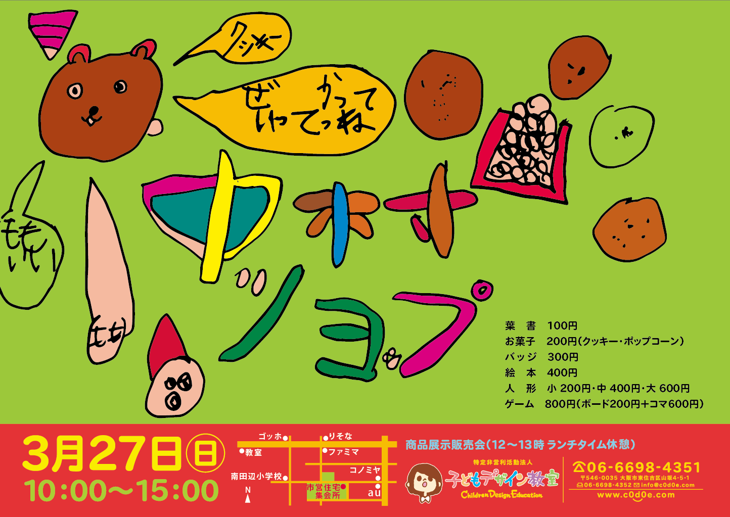 12月のレッスン「ポスターをデザインしよう」の作品「おどかすけのおみせ」です。床裏にすむだいこんのおばけ、おどかすけのお店です。ぜひ。