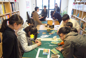 毎月第3土曜日に開催のこどキャラ教室。主に児童養護施設の子どもたち、大阪市立デザイン教育研究所の学生と協働でレッスンをしています。今回は絵本を製本し、待望の絵本が完成しました。後半はお人形作りの準備をしました。