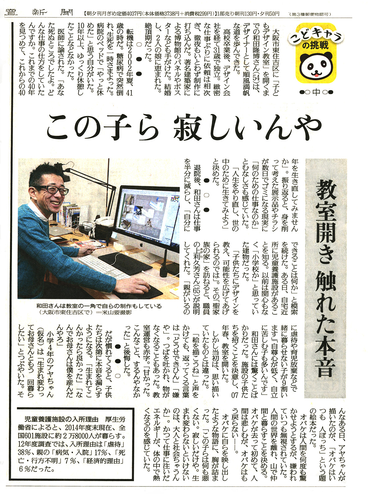 読売新聞夕刊社会面に3日間連載されている「こどキャラの挑戦」中編です。今日は私がこの活動を始めた経緯が記事になっています。最初、子どもたちの背景が理解できず、稚拙だった自分を思い出します。恥ずかしいことですが、ご一読ください。