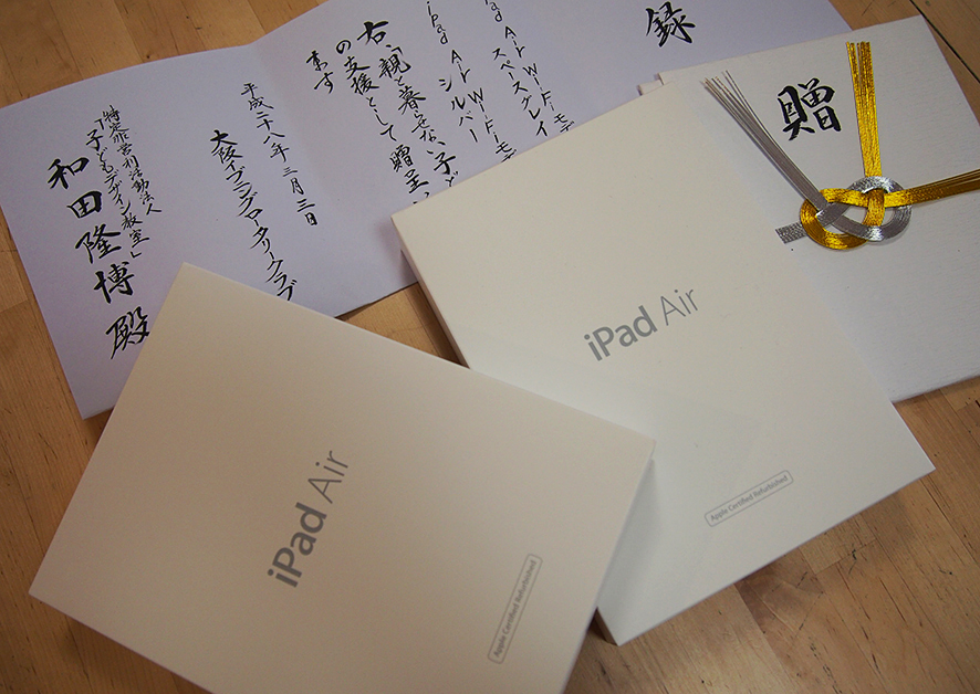 大阪イブニングロータリークラブさんの30周年記念事業として、子どもたちにぜひ役立ててほしいと、iPad Air2台をご寄贈頂きました。コンピュータの数が足りず、困ることもあったので、子どもたちとの親和性が高いiPadは重宝します。ありがとうございます!