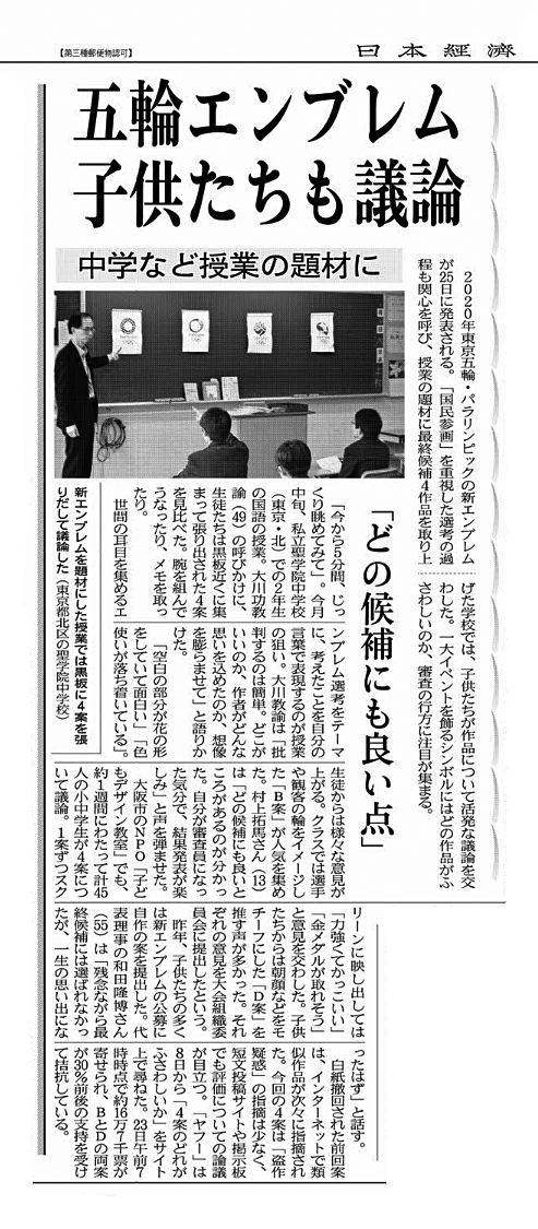 昨日の日本経済新聞・夕刊全国版に東京2020大会エンブレムに関する私のコメントが載りました。どの新聞にも同じ事しか言っていないので、同じようなことが載っていますが、ご報告します。