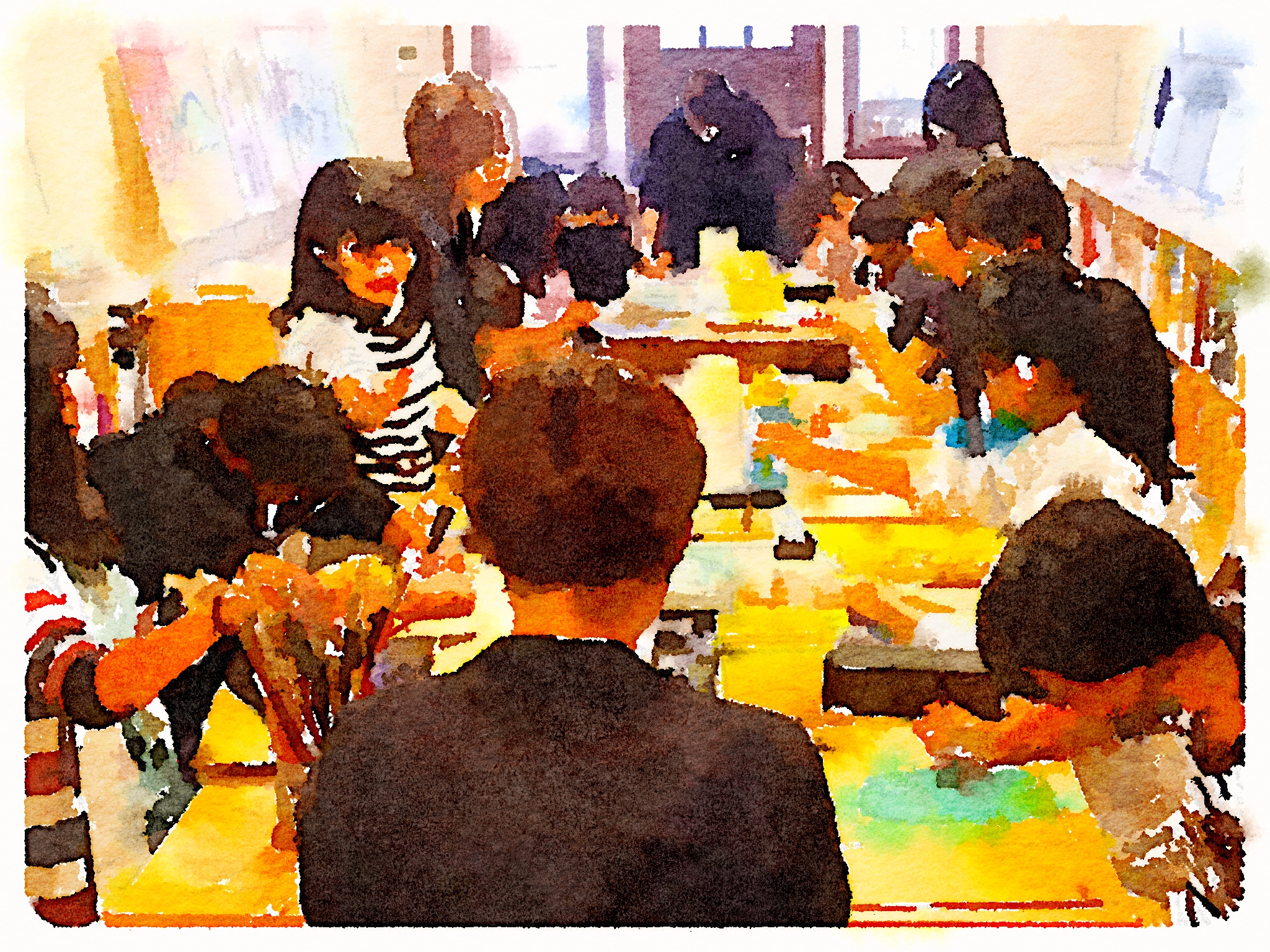 絵本作りのレッスン。どんな絵本にするのか?長い話し合いを終え、ようやく描画作業です!子どもたちもイキイキしています。難しい話し合いが続いたので、そもそもの絵本作りの目的を見失っていないか問いました。