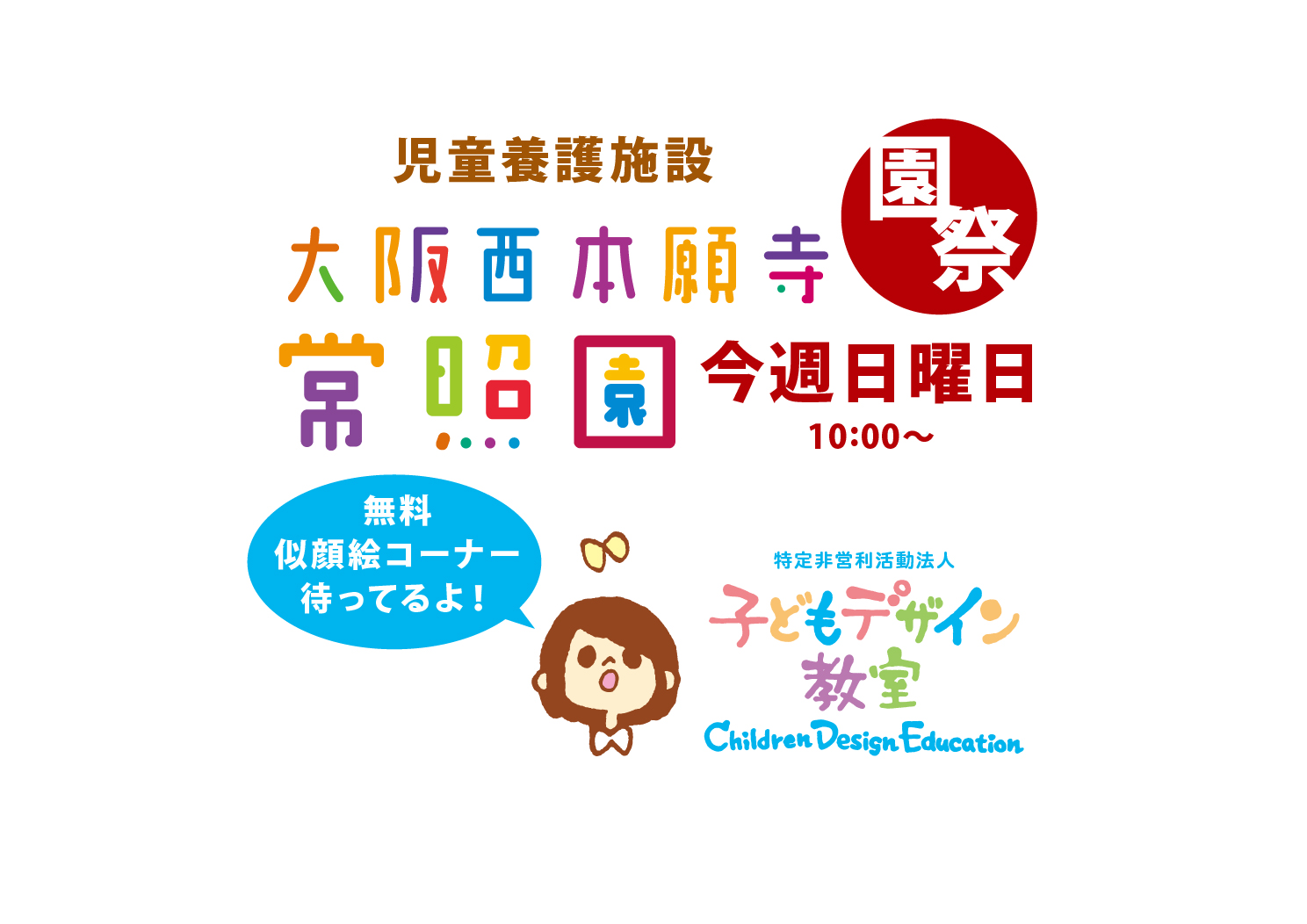 明日日曜13日、吹田市の児童養護施設・常照園で園祭を開催します。子どもデザイン教室は似顔絵コーナーを担当します。大阪市立デザイン教育研究所の学生と、バチバチの似顔絵を描いて差し上げます。お値段はもちろん無料、ぜひ、お越しください!