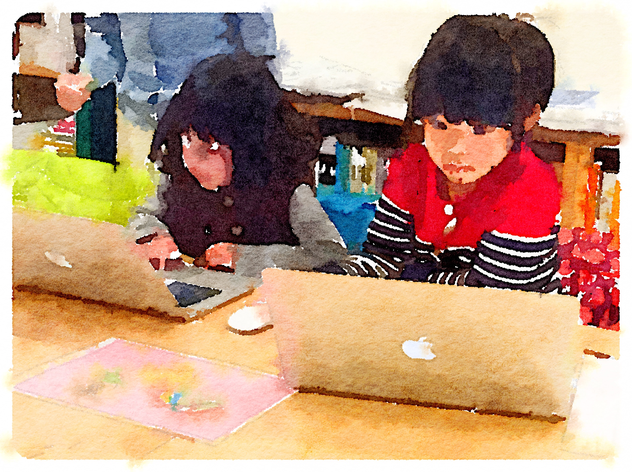 3月26日㊐開催の商品展示販売会用のポスターをイラストレータで作っています。幼稚園の子らも今日から初挑戦です。最初は怖がって臆病でしたが、やがてすぐ、教えようとする私の手を振り払ってスクリーンに釘付けです。物覚えが良過ぎて作業が早いです。