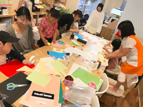子どもデザイン教室の主に年少者向け「造形工作レッスン」。自由にお絵かき・立体にチャレンジします。5月はレッスン「迷路ボックス」をしています。ボランティアさんのご協力もあり、緩やかな雰囲気の中で進んでいます。