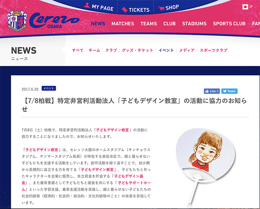 ルヴァン杯、無敗の快進撃を続けるセレッソ大阪のホームページに子どもデザイン教室のイベントが掲載されました!来る7月8日㊏、キンチョウスタジアム北口イベント広場で似顔絵うちわ「うちはにがおえやさん」の実演販売します。利益は児童養護関係にすべて募金します。ぜひ!