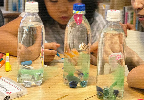 夏休みといえば自由研究でしょ!ということで今月は、理科実験を子どもデザイン教室風にアレンジして週替わりで工作を楽しみました。1週目は1週目はスーパーボールの跳ねる力を利用してロケットを飛ばすおもちゃを、2週目は細長く切った厚紙で作る高い塔を、3週目と4週目はペットボトルで空気砲とアクアリウムを作りました。