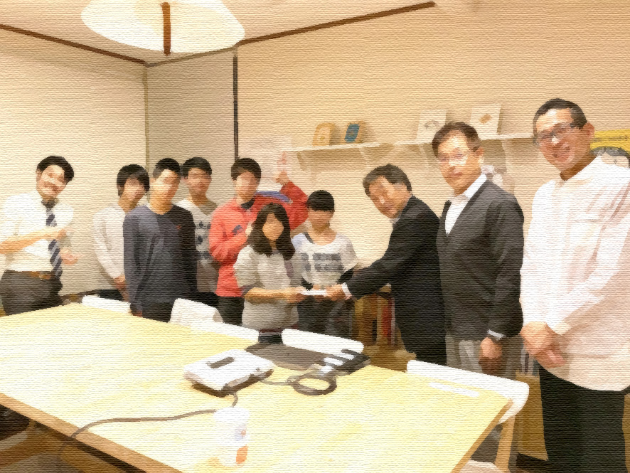 10月21日㊏、生野区の児童養護施設 田島童園の施設長 下川隆士様、事務主任 香川秀嗣様をお招きし、さる7月8日㊏長居キンチョウスタジアムで開催された、子どもデザイン教室のイベント「うちは似顔絵屋さん」における売上金・寄付金の総額69,211円をご寄付いたしました。