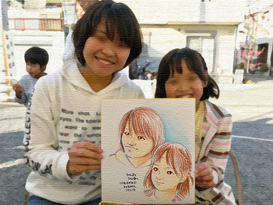 子どもデザイン教室では、社会的養護児童関係の施設なら無料で似顔絵描きにお伺いします。お気軽にお声がけください。