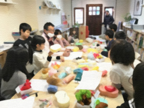 自分で商品を作って、売って、貯金する「グッズデザインレッスン」。1週目は、お人形の残り作業をしました。ノルマ4個に達成していない子は全速力で取り組みました。要領を得た成果もあって、多くの子が4個以上を完成させました。