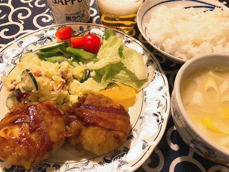 妻、家出中(旅行)につき、お弁当・夕食、作りました。3時間もかかりました。やはり、妻は凄いです。メニューは、ポテト大好きな一番下の子のリクエストで、マッシュポテトとチーズを豚バラ肉で巻き、甘辛く包み焼いたものとかりかりウインナーポテトサラダ。