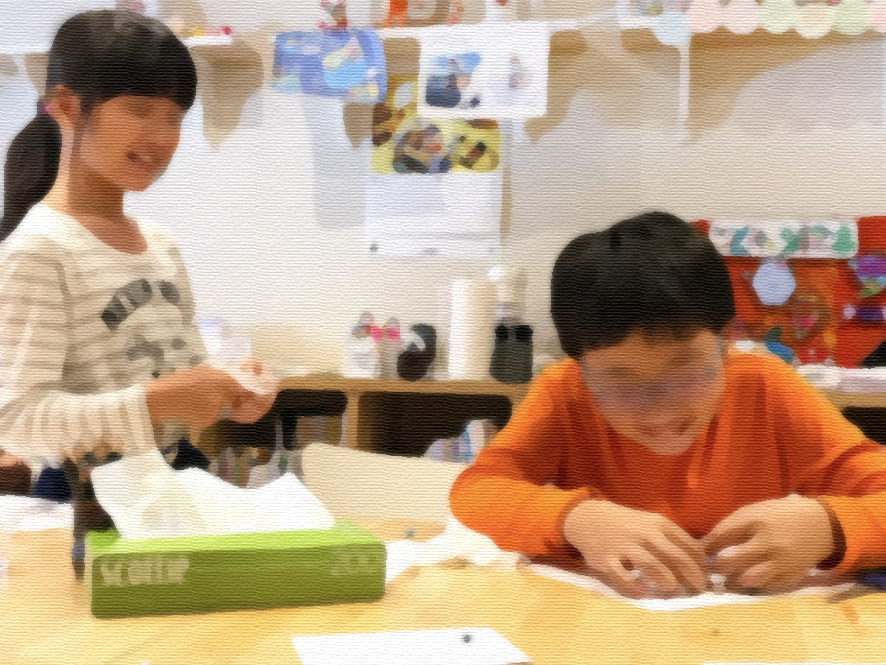 キラキラのアクセサリーを作った幼・小向けレッスンでは、努力することに力点を。販売会に向けて絵本やピンバッジの仕上げを共同作業した小・中向けレッスンや、社会的養護児童向けレッスンでは、対話することに力点を置きました。