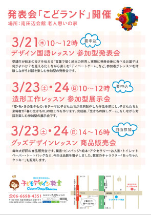 子どもデザイン教室の2018年度を締めくくる体験型発表会「こどランド」を開催します。国語レッスンの体験型発表会、造形レッスンの参加型展示会、そしてグッズレッスンの商品販売会と盛りだくさんです。ぜひお越しください。