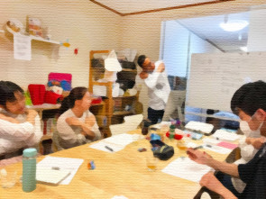 創造デザインレッスン。くじ引きで引いたお題を制限時間内に作り、それが何かお互いに当て合うゲームをしました。時間内に仕上げること、創造的に物事を発想することを楽しいゲーム感覚で会得しました。皆とてもうまく表現できていて、高得点のバトルに私たちもエキサイトしました。