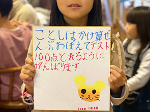 2020年最初の創造デザインレッスンは書き初めでした。ダンス、プール、掛け算、早寝早起き、ご飯、今年一年頑張る想いを書きました。グラデーションの塗りかたを覚えながら発泡スチロールでねずみのイラストのハンコも作り、新年の誓いに華を添えました。