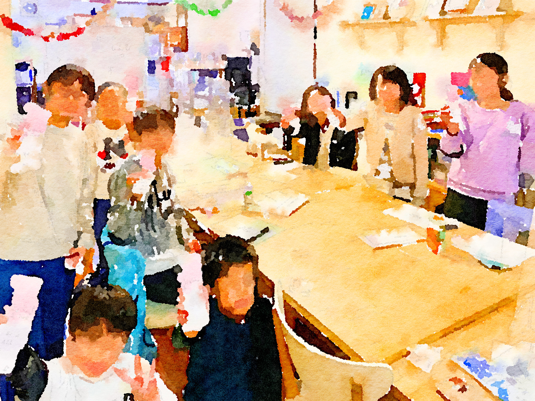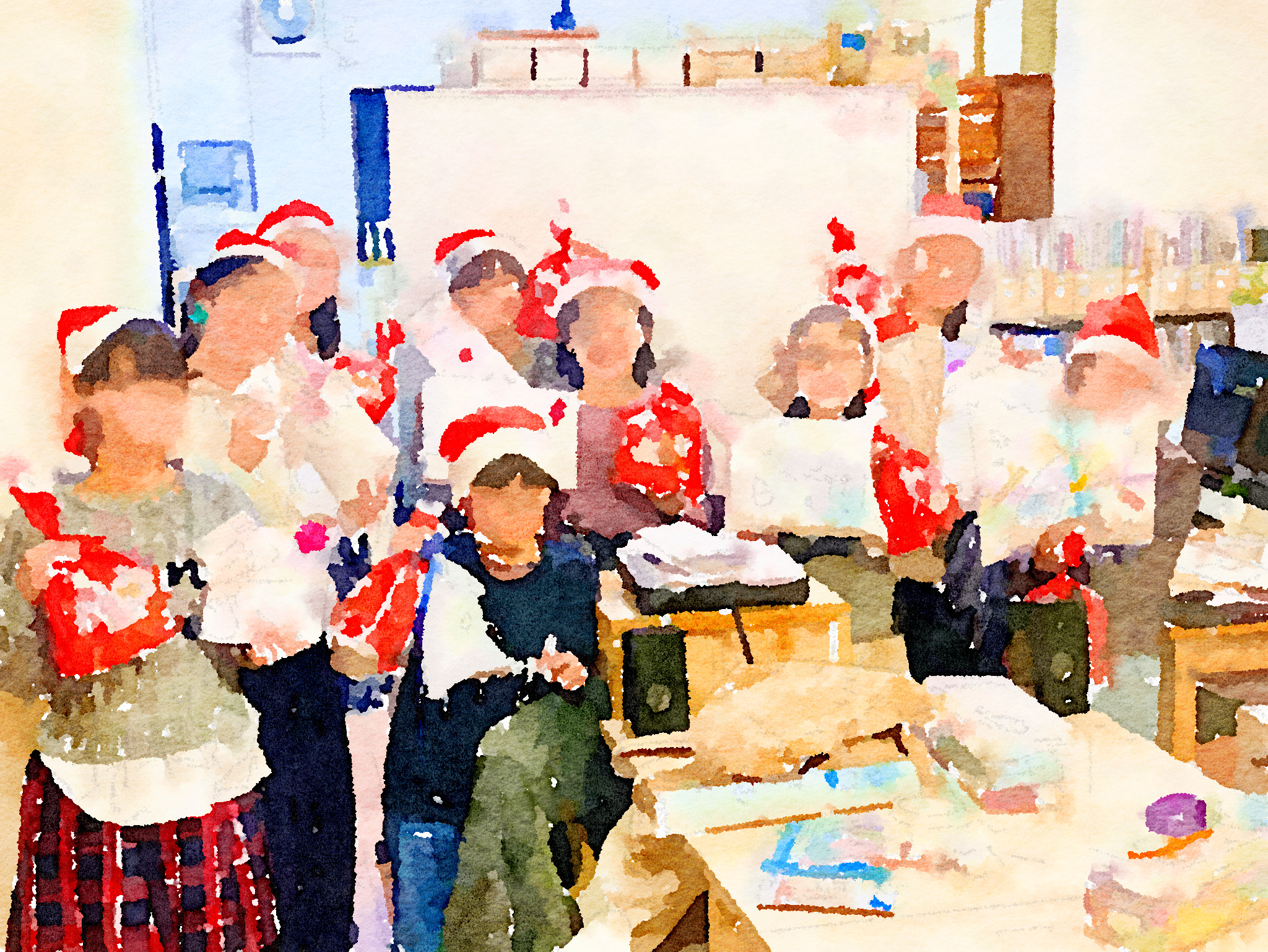 今年最後のレッスン。持ち寄ったお菓子をラッピングして、自分の気持ちをメッセージに込め、発表とプレゼント交換をしました。皆工夫した包み方や絵、装飾で、さすがはこの教室の子どもたちです。恒例、ヤスさんサンタからのプレゼントも抱えてホクホク顔で帰路につきました。