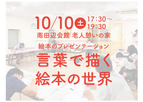 10月10日㊏17:30~19:30、南田辺会館老人憩いの家で、絵本のプレゼン「言葉で描く絵本の世界」をします。子どもたちがお気に入りの絵本を1冊選び、その本をこんな人に読んでほしいとプレゼンします。そして普段は言わない「本当の気持ち」を伝える発表会です。