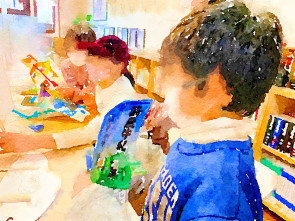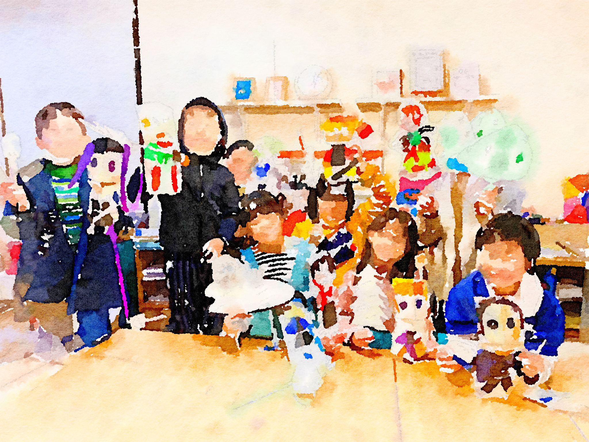 創造デザインレッスン。新年最初は要望の高かった人形劇をしました。人形の仕上げをするチームとルールを設けず(スタッフが内容を記録し)自然の流れで劇を楽しむチームに分かれました。今回で終わりのつもりでしたが、子どもたちノリノリで、来週前半少しだけ続きをします。