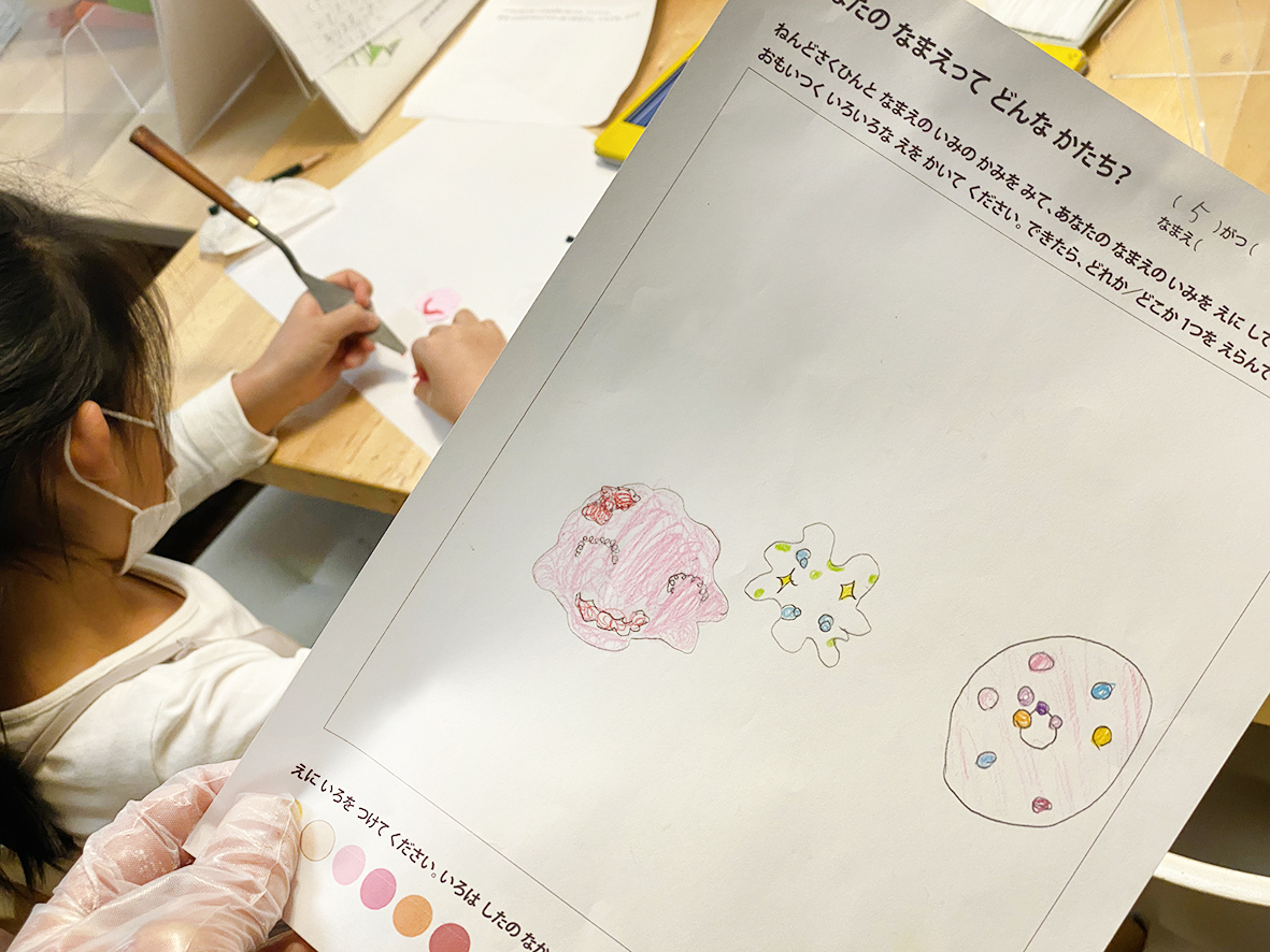 5月1週目の話してコースは自分の名前を題材にフィモ粘土でピンバッジを作りました。最初、前に作った粘土作品と自分の名前の意味を振り返り、新たな考えで自分の名前を絵にし、その後ピンバッジにしました。皆、抽象的な概念を会得したことは大きな成果です。