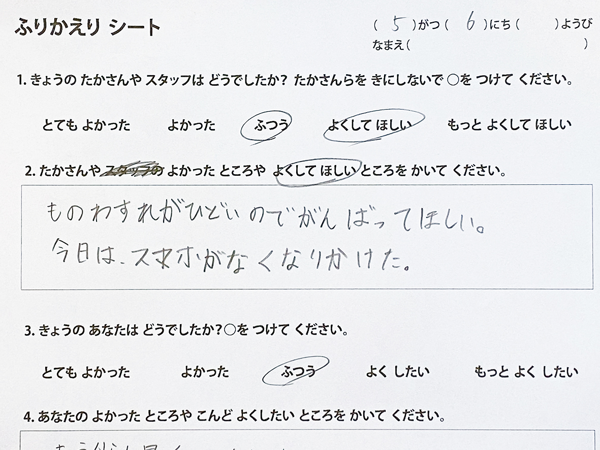 子どもデザイン教室では、レッスン終わりの振り返りの中で、私やスタッフの評価を子どもたちにお願いしています。するとご覧のようなご意見が。評価を受けるのは大事ですね。殆どは良いという評価ですが、話し方が早いとか、気付かない指摘もあり、次に活かすことができます。