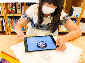 5月第4週。名刺の構図、似顔絵・呼び名の下絵など準備が整ったので、いよいよiPadで制作です。iPadのさらに高度な技法を教えました。皆、対象を見ないで描くので、目や口を描くのが苦手です。そこで目や口がどういう理屈で絵に描かれるのかを説明した所、凄く納得していました。