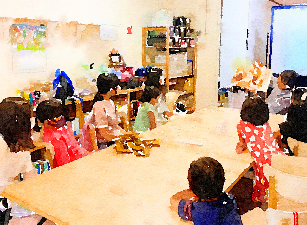 梅雨の季節を楽しめるように雨傘をデザインしています。本番前に梅雨をイメージできる様に梅雨にまつわる絵本の読み聞かせをしています。教室の絵本セレクションから選んだ1冊は「あめのもりのおくりもの」です。素晴らしく美しい雨の絵本に皆しっぽりと聞き入っていました。