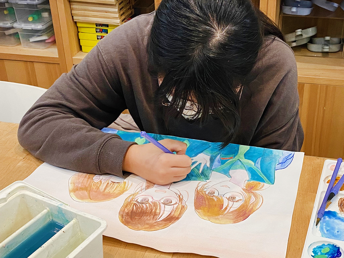 絵本と関連する自分の出来事の絵を描きました。今日中に仕上げないといけないハードワークでしたが、集中力高く、ほぼ仕上げられました。水彩絵の具とサインペンを使い、効率のよい色の塗り方や美しく見える配色の仕方を指導しました。