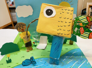 今月の絵と工作レッスンは前月の続きでジオラマ工作(背景のある工作)をしています。最初は構想を練る自分との対話の時間です。ぼんやりして動きませんが、「早く始めて」とか、せかしてはいけません。その後、好奇心が爆発するように、一気に制作を進めました。