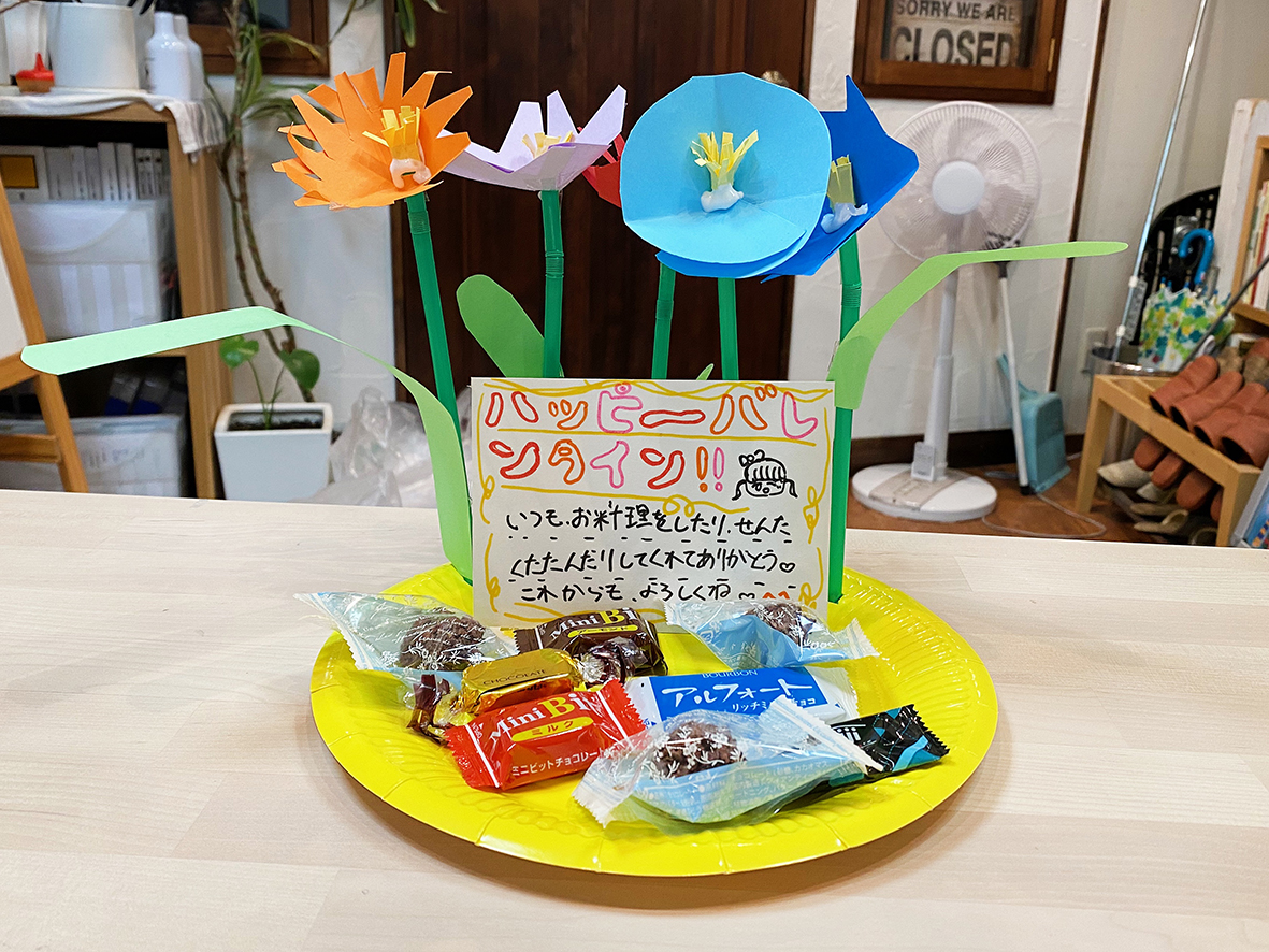 バレンタイン直前ということで、お皿にカラフルな花を刺したチョコプレートを作りました。チョコプレートにはメッセージカードを添えて、一緒に住む人への感謝の気持ちを伝えます。皆で一緒に甘い時間を召し上がってください。