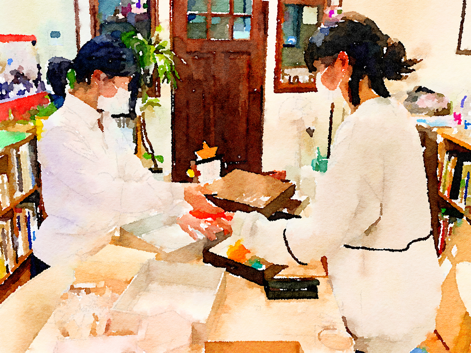 今月の絵と工作レッスンは前月の続きでジオラマ工作(背景のある工作)をしています。最初は構想を練る自分との対話の時間です。ぼんやりして動きませんが、「早く始めて」とか、せかしてはいけません。その後、好奇心が爆発するように、一気に制作を進めました。