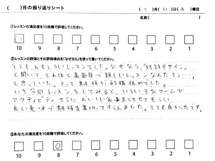 自己紹介の機会はこれからの人生で何度も訪れ、良好な人間関係には欠かせない出来事です。対話力不足の子どもたちの自己肯定感を育てるのがこのレッスンの狙いです。体験レッスンを受けた子が嬉しい振り返りを書いてくれました。子どもたちにとても大切なレッスンと考えます。