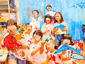 7月のレッスンは、暑い夏を涼しい気持ちで楽しんで貰おうと、子どもデザイン教室を水族館に見立てた「皆で水族館を作ろう」をします。最初のランチタイムで珊瑚礁の美しい映像を見ました。こうして気分を高めてから、海の生きものを色紙を切り貼りして工作しました。