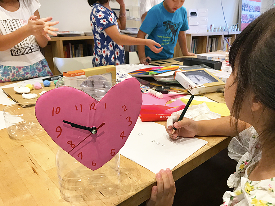 創造デザインレッスン。百均の画材や廃材を使い設計図に従って工作を始めました。ハートの時計、的当て、ロケットの色鉛筆、的当て、人形、ネックレス、粘土細工など、創造力豊かな作品ができそうです。急いで作るのではなく、最後まで頑張りきる気持ちを大切にしています。