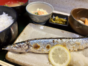 秋だな〜、今年は秋刀魚が豊漁らしいなんて、呑気なことを考えて西田辺の裏道を歩いていたら、「新さんま塩焼き」の文字が飛び込んできて、まんまと釣られてしまいました。普段は袋麺とかコンビニとかで済ます昼ご飯ですが、この日は今年初、おいし〜い秋刀魚を戴きました。