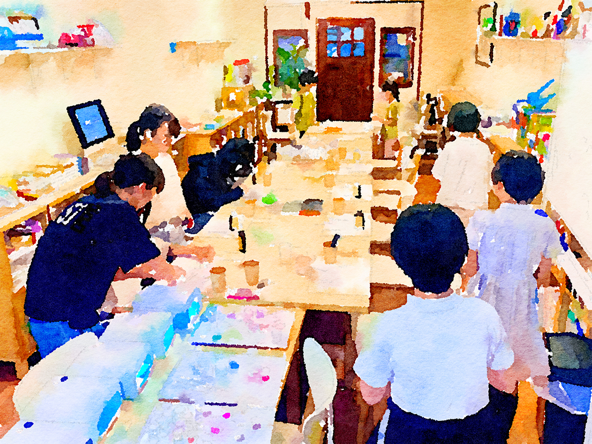 土曜日は児童養護施設の子どもたちをお招きしてのえとこうさくレッスンでした。あいにく施設の予定と重なり、3名の参加と少なかったのですが、子どもの高い要望を訊くうちに、おとなもついつい本気になる熱のこもったレッスンでした。