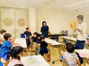 児童養護施設で出張レッスン「粘土でゆるキャラを作ろう」をしました。無意識のなぐり描きからゆるキャラを産み出し、それを小麦粘土で成形します。そして、ゆるキャラの名前や性格を決め、挨拶文にします。最後にゆるキャラの住む世界を絵にすると、立派な絵物語の完成です。
