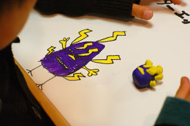 GWが明けて子どもたちは今日も元気です。教室ではコマ撮りアニメの撮影が続いています。手隙の子は新しいキャラクターを粘土で作っています。しんど〜、めんど〜とぐちるわりに、最後までせっせと取り組んでいます。アニメの作り方