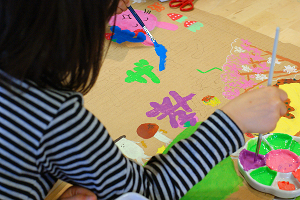 4月、新年度がはじました。子どもたちとデザイン教室の看板を作り直しています。『ひとり1点ずつ自分のキャラクターを描いてね』というと、みんなスラスラ〜と描いていきました。